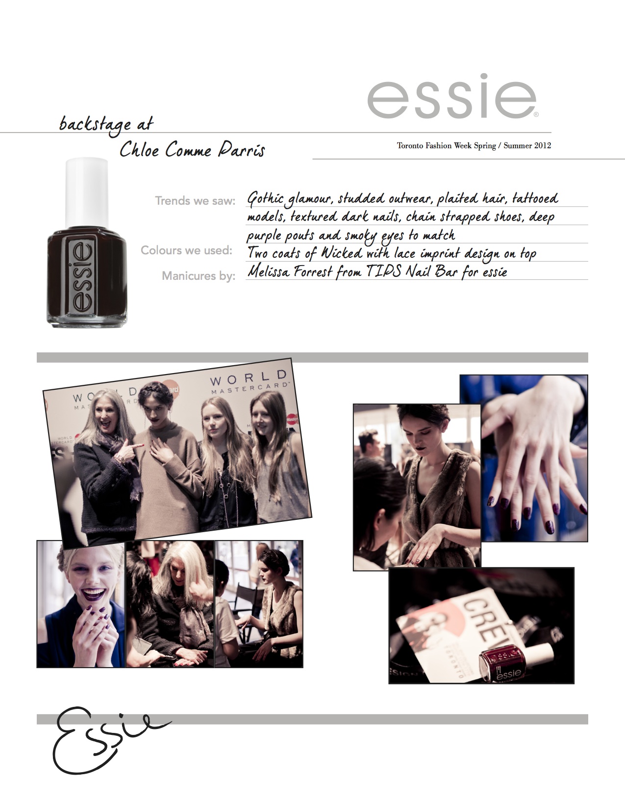 Essie nails were all the rage on the runway, showcasing nail trends at Lucian Matis, Soia & Kyo, Pink Tartan, Ezra Constantine, Rad Hourani and Travis Taddeo! Gothic glamour at Chloe Comme Paris was complemented by essie nails in Wicked with a lace design on top!